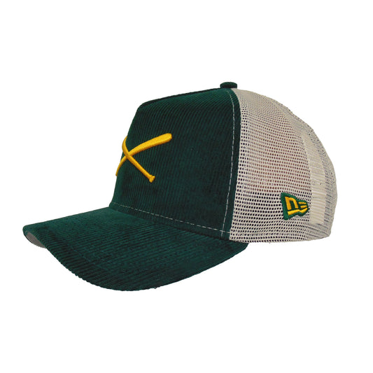 Justfitteds Crossed Bats Logo New Era 9FORTY AF Trucker Cap DGRN Corduroy